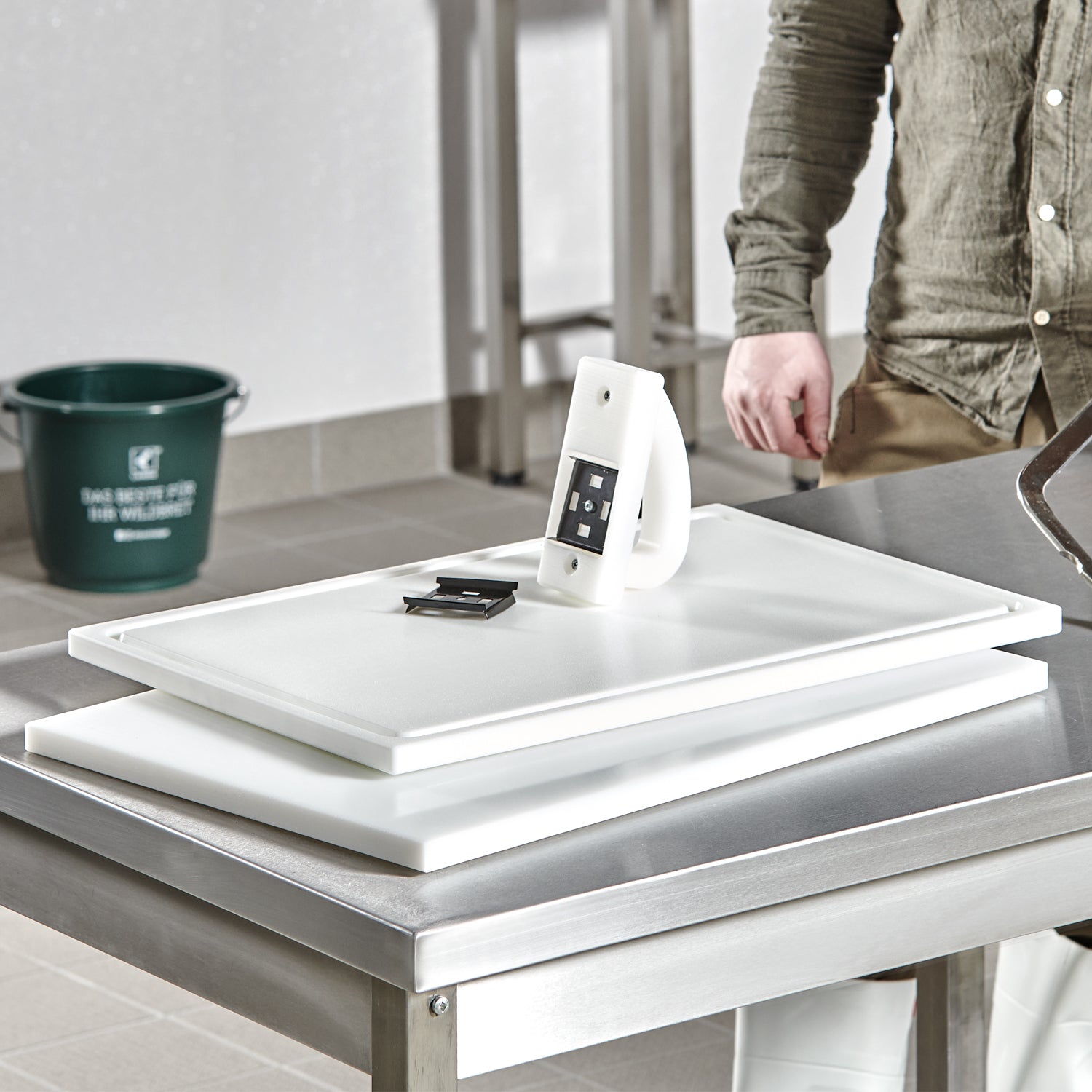 White cutting board made from cut-resistant and knife-friendly quality special plastic. With surrounding juice groove and sturdy feet underneath for excellent grip