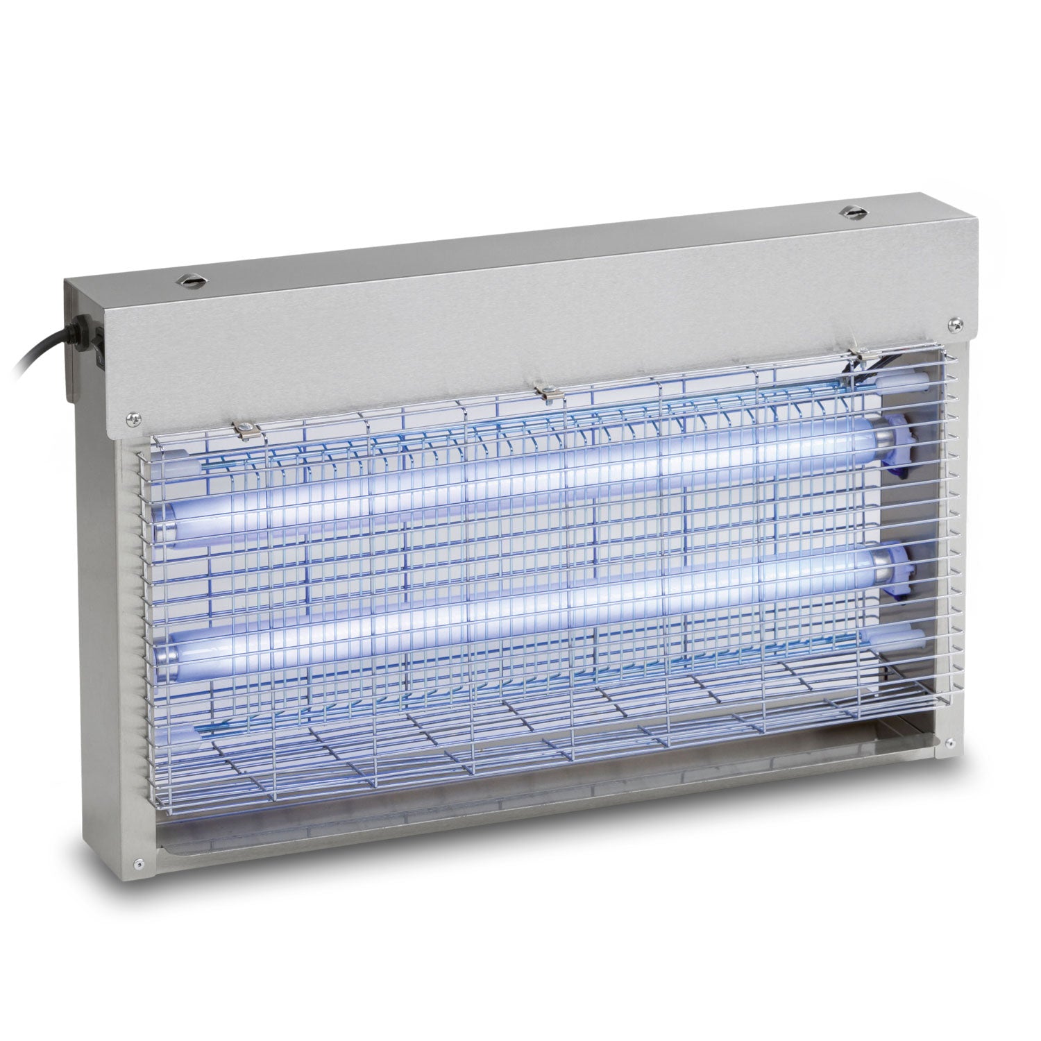 Electric fly killer with durable stainless steel housing, suspension chain, collecting tray and a special UVA lamp with high insect attraction.