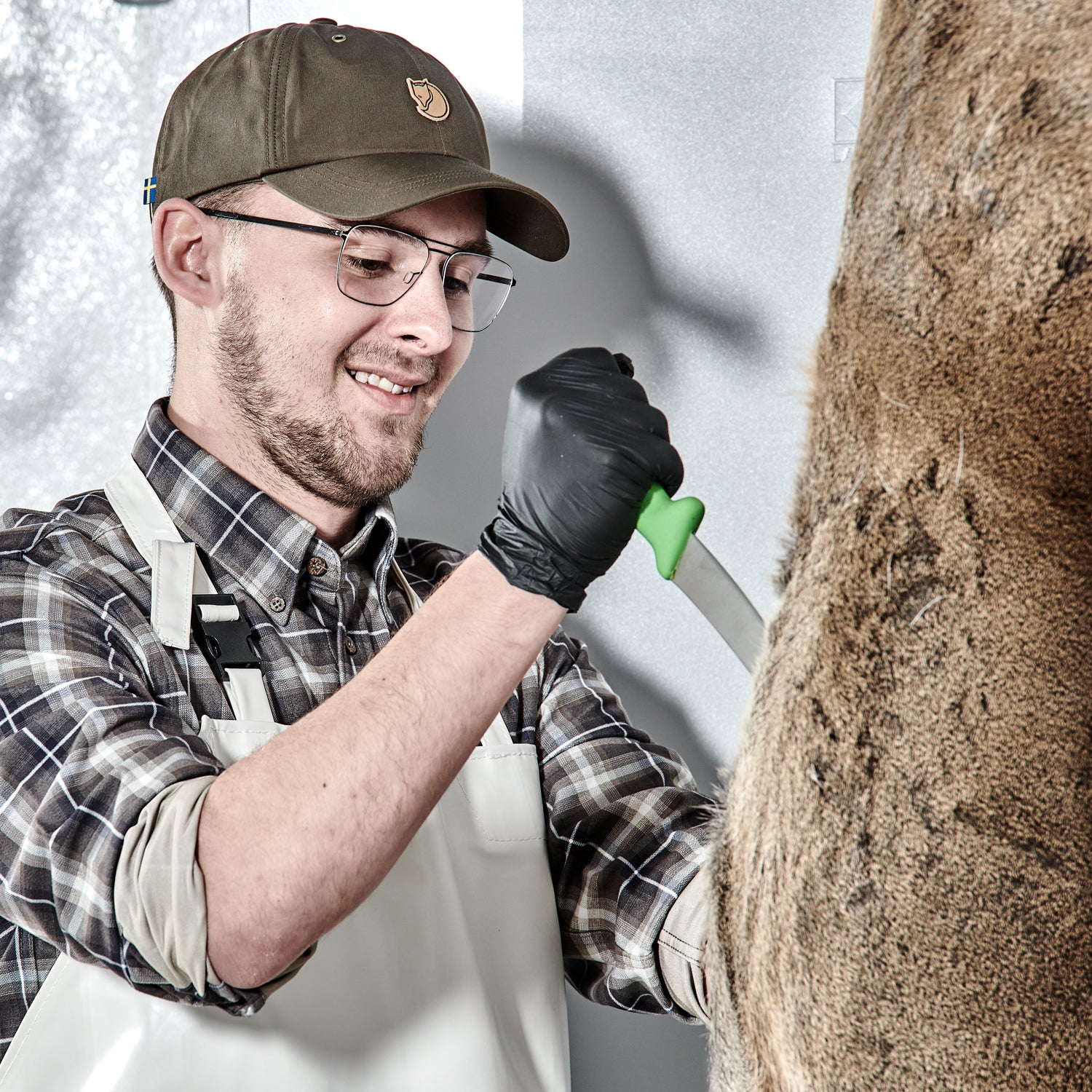 Giblet knife with green handle, ideal for prising open. The rounded tip prevents damage to the giblet and the “rotated handle”
